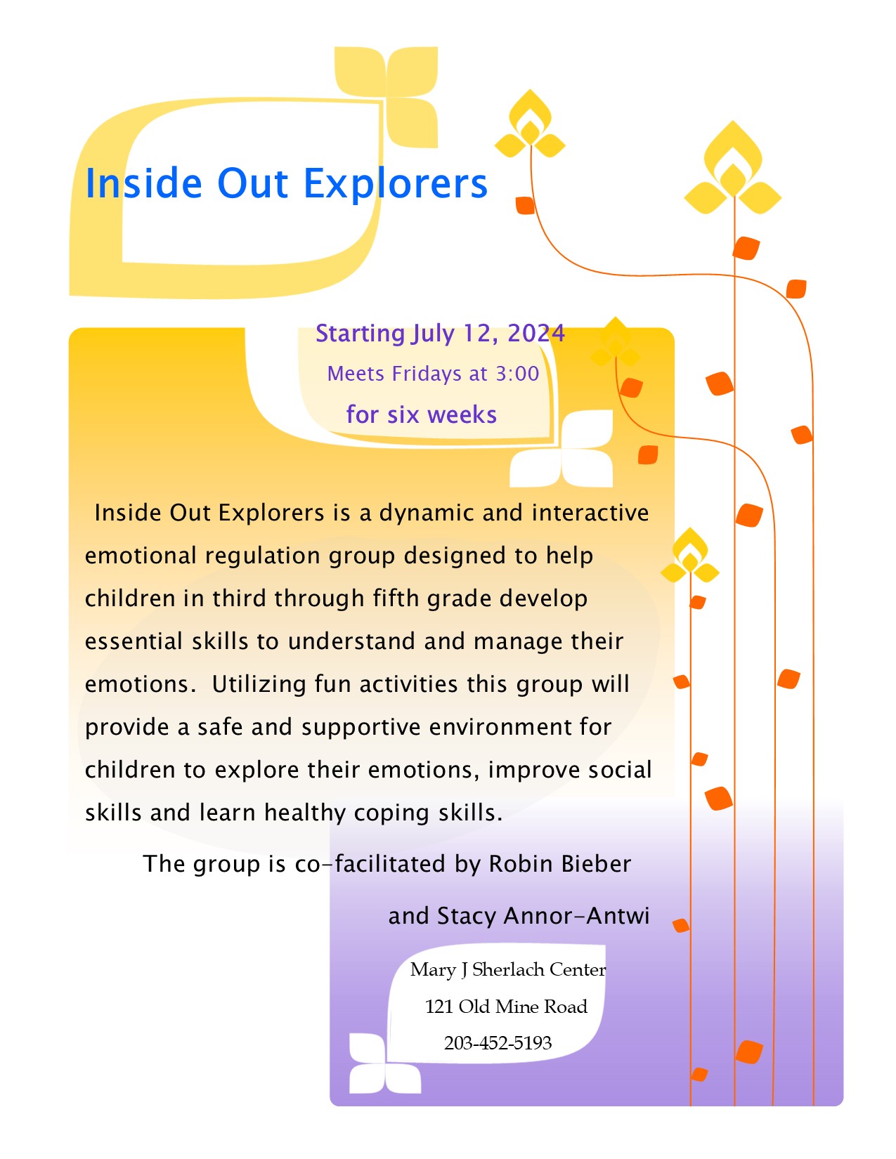 Emotional regulation group for 3rd – 5th graders. Six weekly session starting 7/12/2024. For more information, please contact the Counseling Center. 203-452-5193.