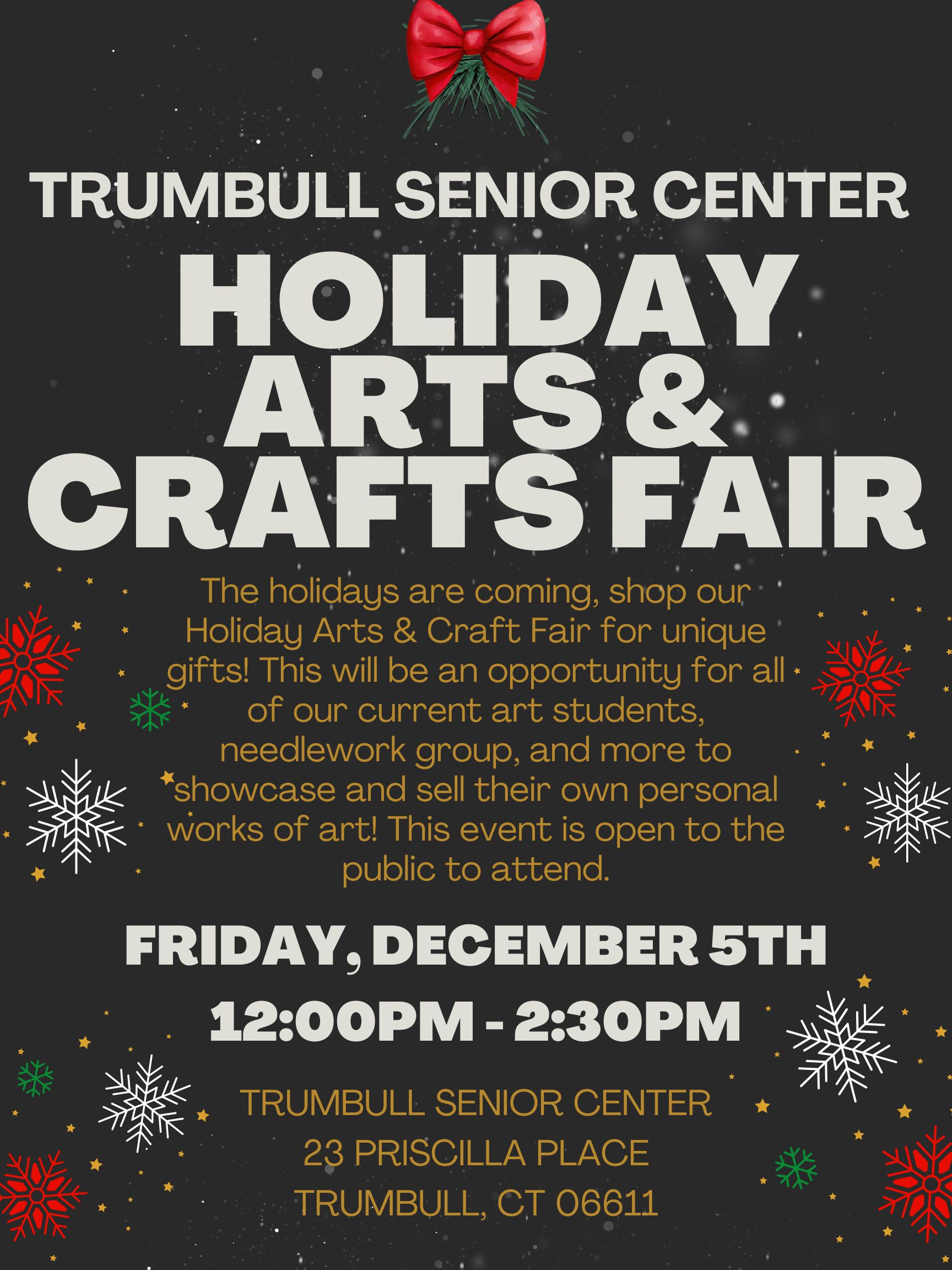 Join us at the Trumbull Senior Center on Friday, December 5, 2025 from 12:00 PM to 2:30 PM for our Holiday Arts and Crafts Fair.